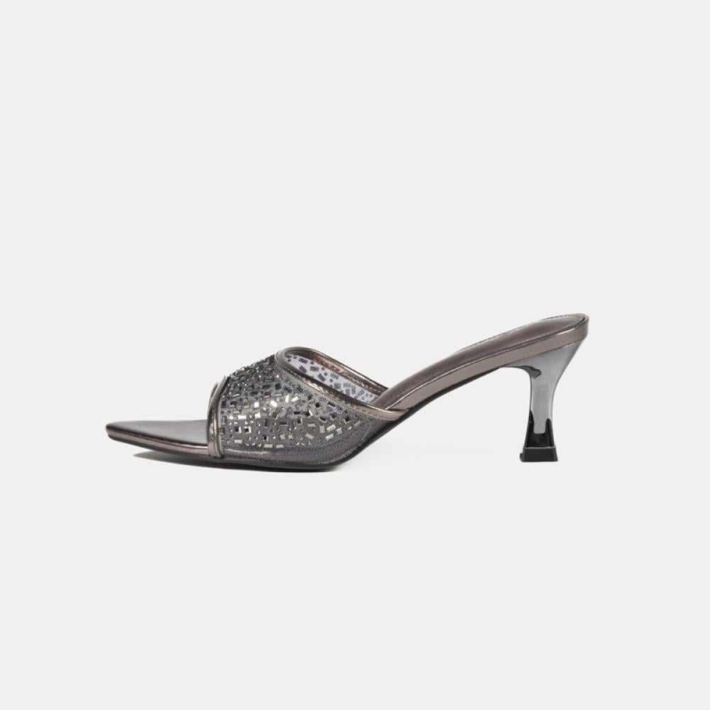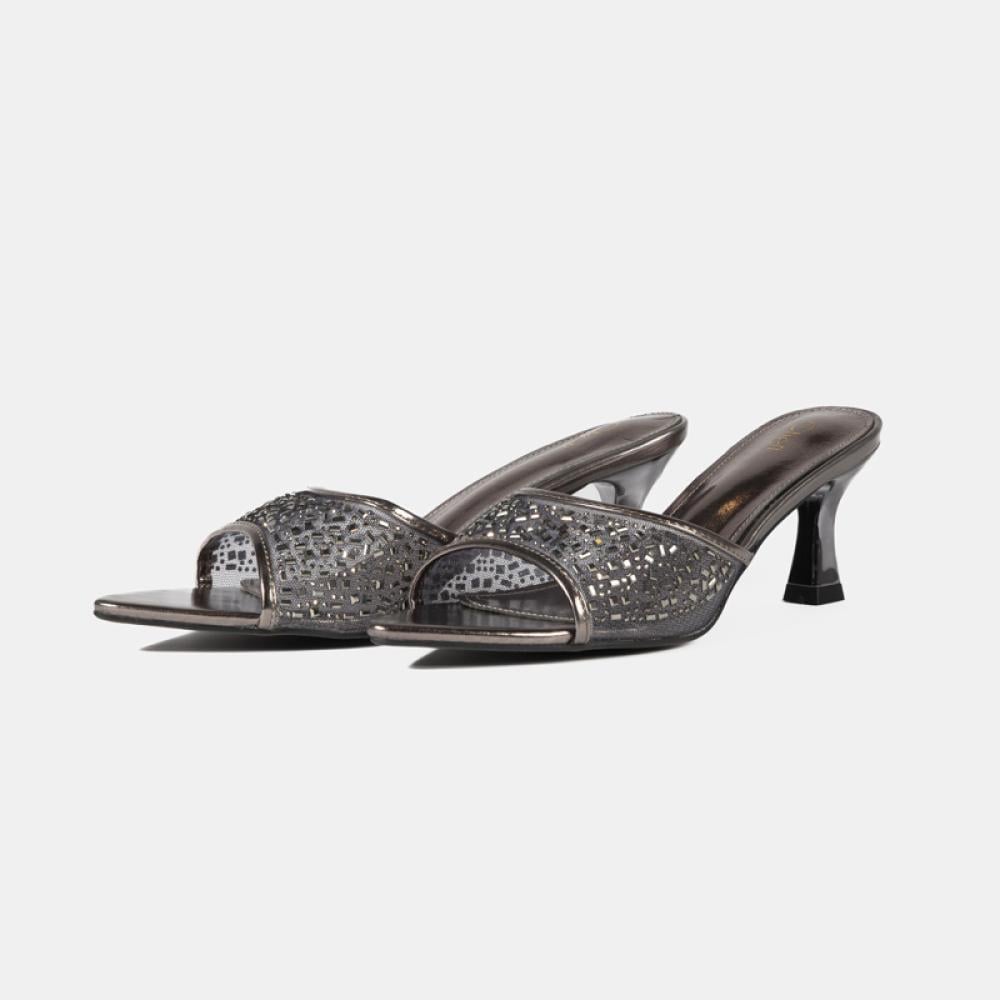 • حذاء كعب منخفض من الجلد اللامع مفتوح من الأمام والخلف مزين من الأعلى بقطعة شفافة مرصعة بكريستال تزيد من جاذبية المنتج